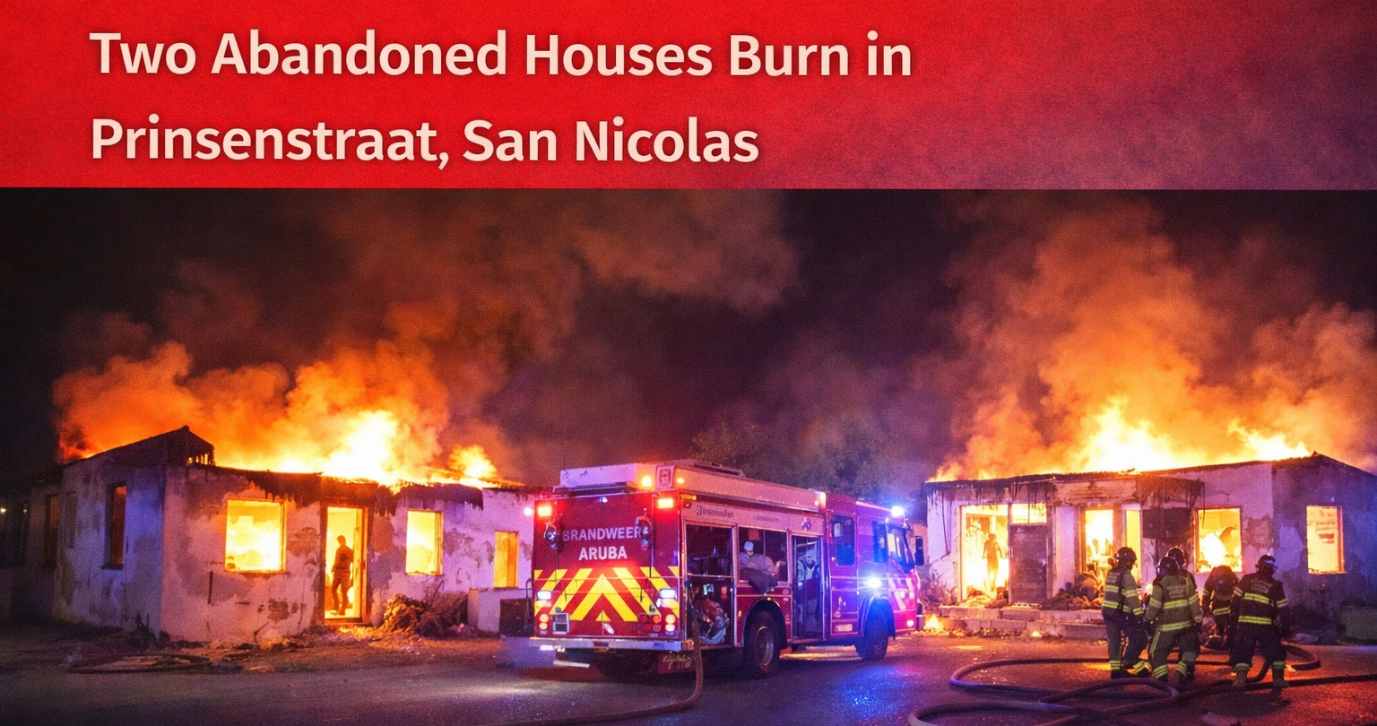 Two Abandoned Houses Catch Fire in Prinsenstraat, Aruba – On Sunday night at around 10:00 PM, multiple police patrols and Fire Department units were urgently dispatched to a house fire in San Nicolas.