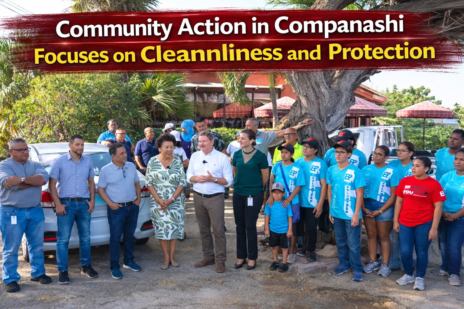 Accion di Bario na Companashi cu Limpiesa – During the Community Action in Companashi on Thursday morning, the Government once again left their offices to go directly into the community, listen to needs, and offer concrete assistance. The action began in front of Smith & Dorlas, where recognition was given to Ms. Ingrid Nicolaas, an entrepreneur who has been running her coffee shop with respect for the environment since the 1990s, ensuring the protection of trees surrounding her establishment.