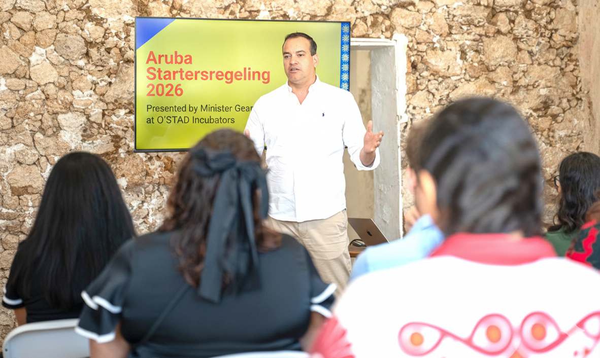 As part of the government’s vision for a more resilient, diversified, and sustainable economy, Minister of Finance, Economic Affairs and Primary Sector Geoffrey Wever presented the Aruba Startersregeling 2026 to O’STAD Incubators and members of Impact Hub Aruba. The initiative forms a key pillar of Aruba’s broader economic strategy to support entrepreneurship, innovation, and the revitalization of downtown Oranjestad.