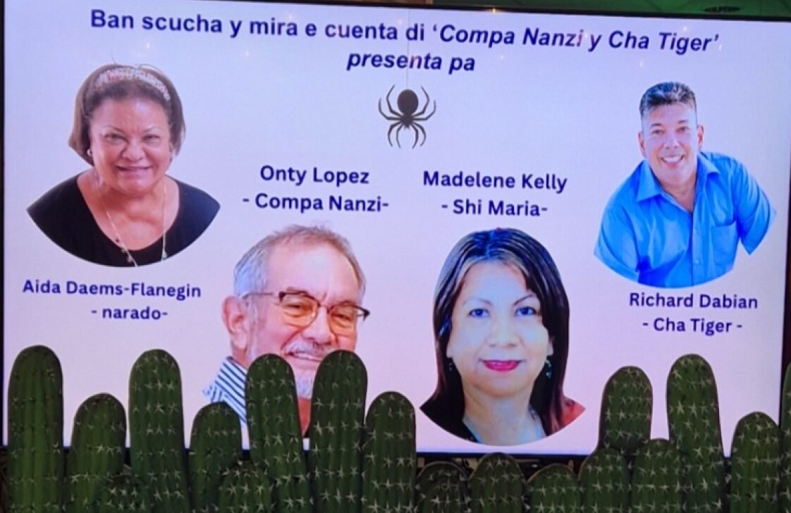 The book launch at the National Library of Aruba was a special event. The event featured a cast of actors, including Richard Dabian (Cha Tiger), Madelene Kelly (Shi Maria), Aida Daems-Flanegien (Narado), and Onty Lopez (Compa Nanzi), who presented the story where Compa Nanzi humorously interacts with Cha Tiger.