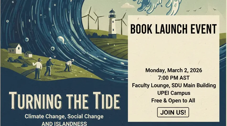 The book launch of “Turning the Tide: Climate Change, Social Change, and Islandness” will take place on March 2, 2026, at 7:00 PM in the Faculty Lounge (Room 201) of the Main Building at the University of Prince Edward Island.