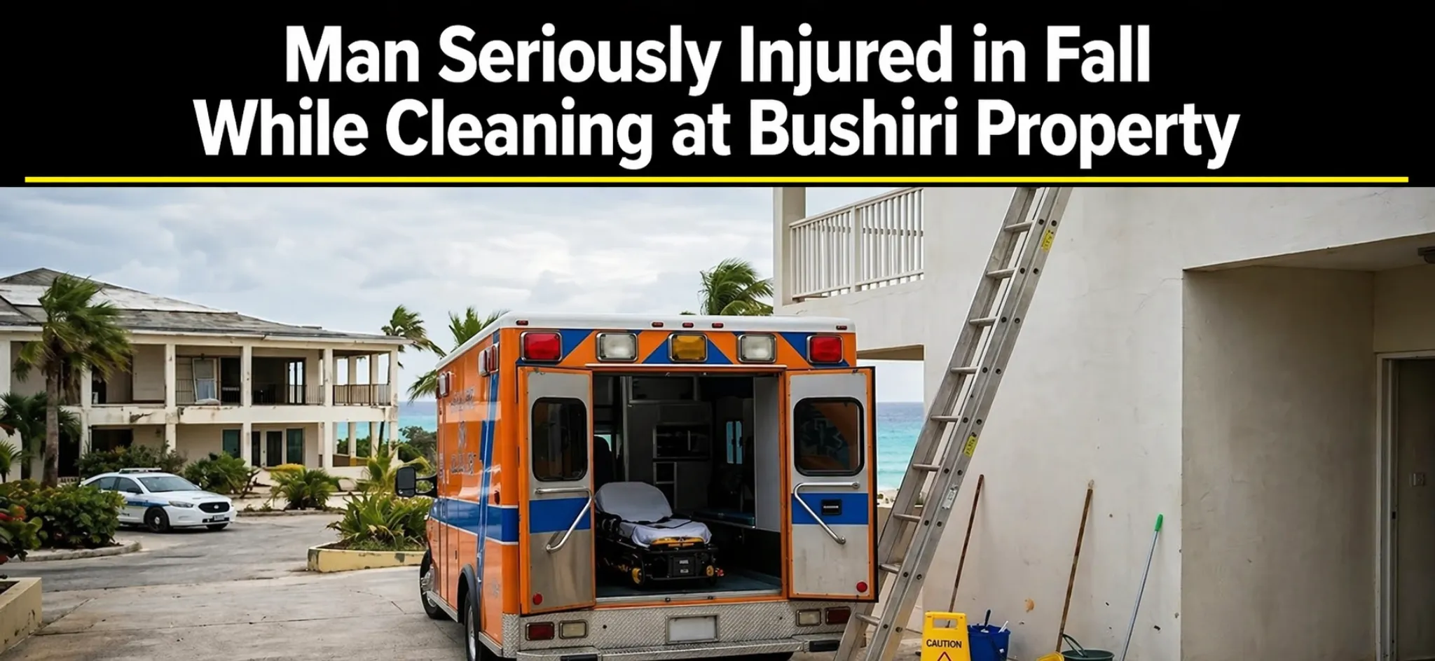 ORANJESTAD (AAN): A man sustained serious injuries Tuesday evening after falling while performing cleaning work at a property in the Bushiri area. The incident was reported to emergency services around 8:40 PM.