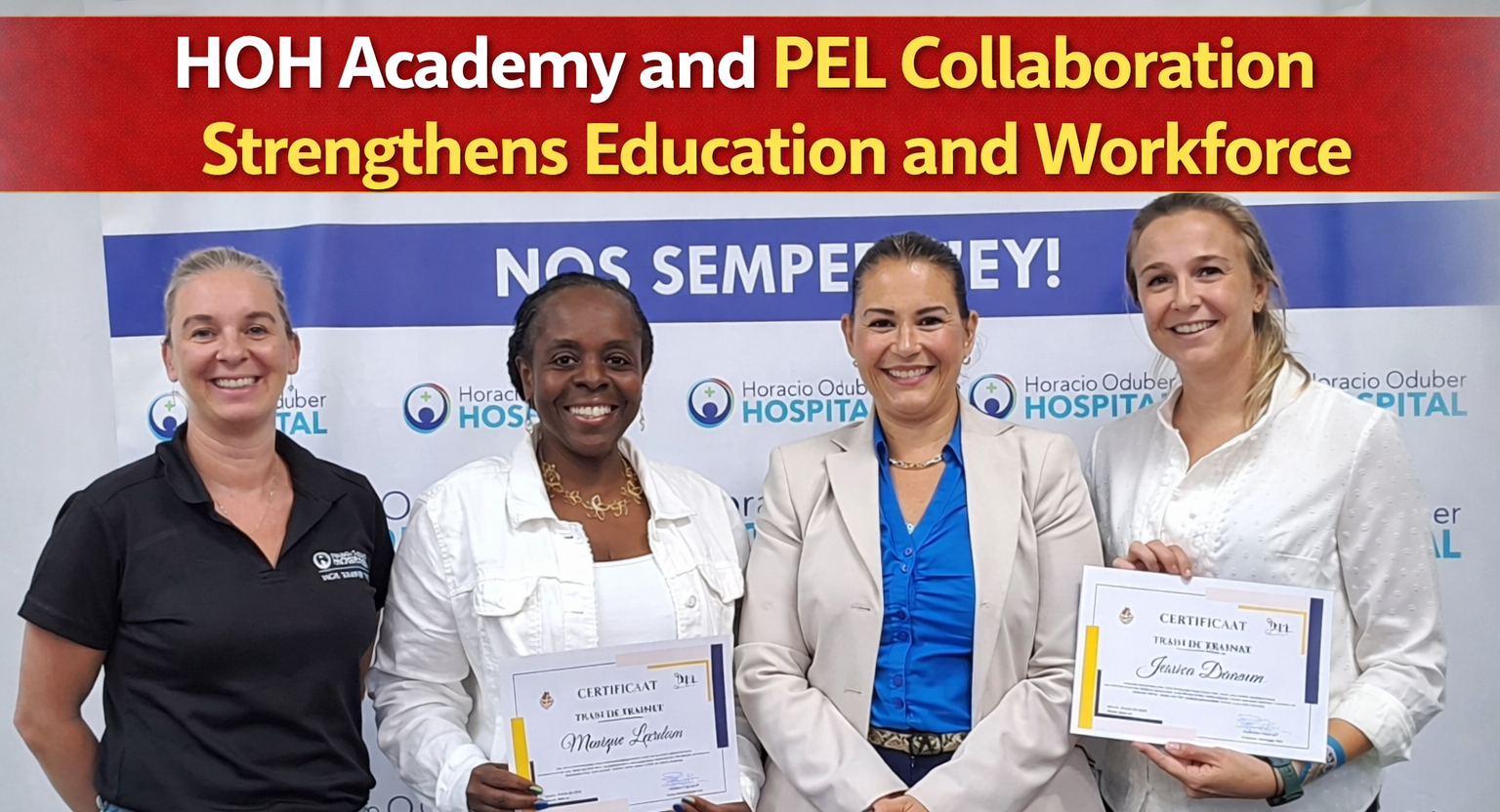 The Platforma Educacion & Labor (PEL) proudly congratulated two professionals from HOH Academy who successfully obtained their Train the Trainer certification. The certified professionals are Monique Leerdam, Teacher Coordinator and Clinical Teacher, and Jessica Daamen, Senior IC Verpleegkundige and Clinical Teacher in training at Dr. Horacio Oduber Hospital.