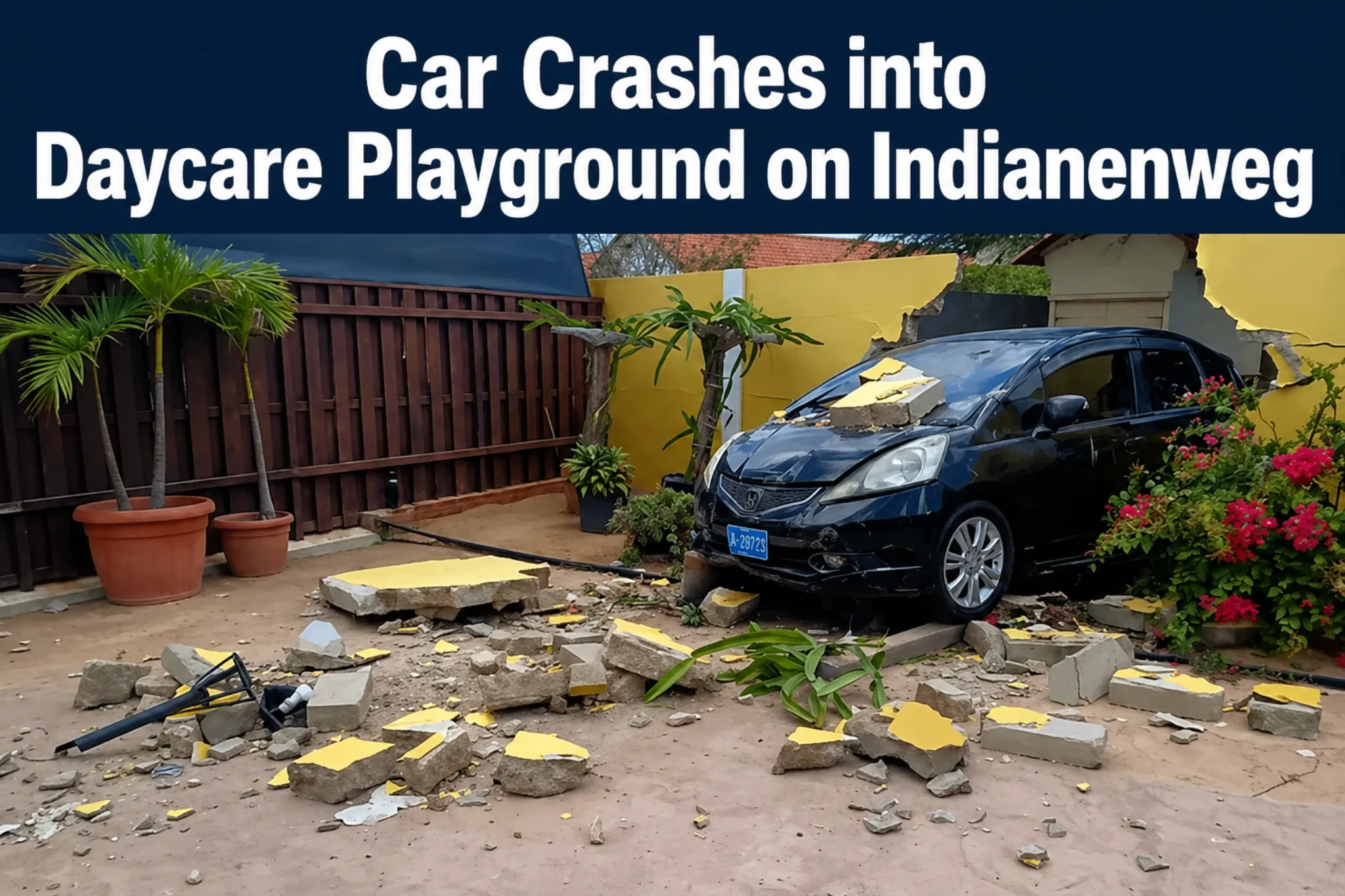 On Sunday morning early, neighbors on Indianenweg were startled by a very loud noise. They went outside and saw a car inside the grounds of the Happy Feet daycare, which is a nursery school. The driver of the dark blue Honda Fit, license plate A-30742, was on Indianenweg road at high speed. For some reason, the driver lost control of the vehicle and crashed into the wall of Happy Feet. The wall was broken and the car ended up inside the school. In this accident, apart from breaking the wall, some plants were also damaged. The front part of the car sustained material damage, with blocks falling on the windshield. The hood and bumper also suffered damage.