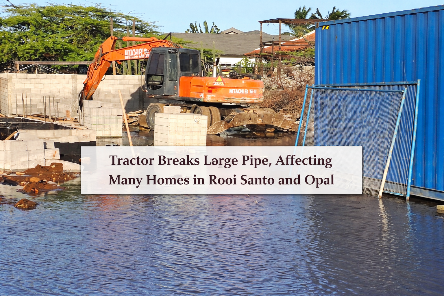 ORANJESTAD (AAN) – On Tuesday evening, just before sunset, a hydraulic excavator operator working with a breaker attachment in the Opal area of Noord accidentally struck and broke a large pipe belonging to WEB Aruba NV.
