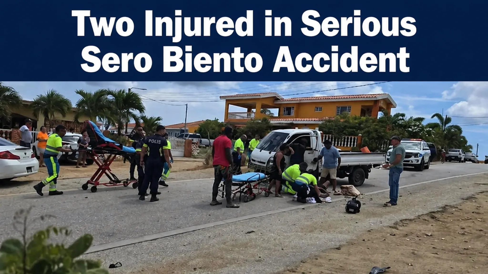 Sunday around 1:30 PM, a serious accident occurred in Sero Biento. At a T-intersection, failure to yield right of way played a major role. Residents heard the screeching of brakes followed by a loud crash. The vehicles involved were a Kia Flatbed and a Nissan Skyline. The impact was severe but the occupants were able to exit the vehicles despite the blows received. Police and ambulances arrived urgently and found people lying on the road. Paramedics immediately began providing assistance and prepared them for transport to the hospital. According to residents, the Flatbed went up the T-road possibly without seeing the Skyline driven by a young man, and due to high speed, crashed into the Flatbed. Residents say the area is dangerous because there is poor visibility for cars coming from the left. Traffic police reportedly used security cameras to resolve the incident.