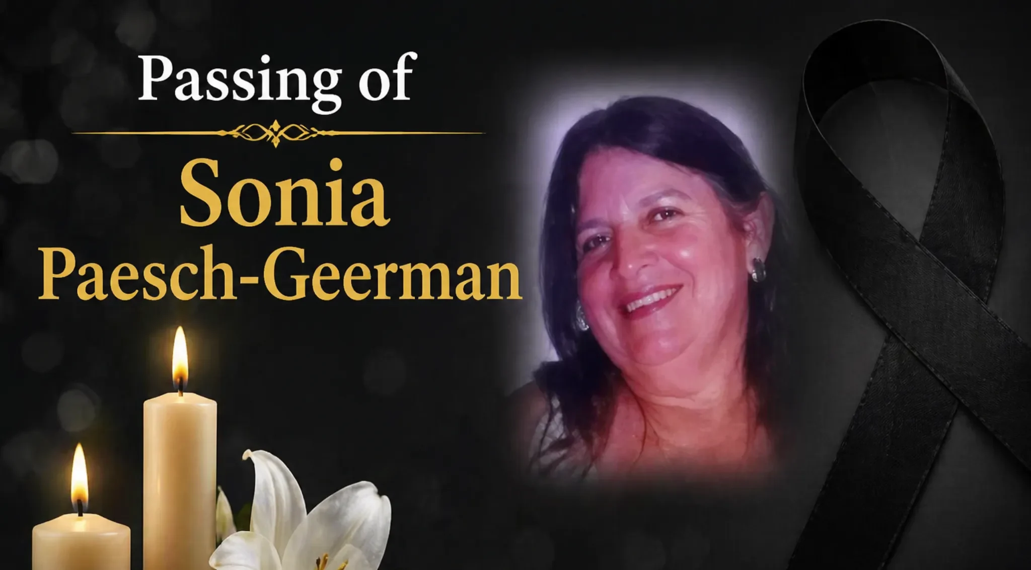 Olive Tree Funeral Care and Crematory has announced the passing of Sonia Paesch-Geerman. Mrs. Paesch-Geerman, born on March 6, 1965, passed away on April 21, 2026. She was the widow of Albertico (Tico) Paesch (q.e.p.d.).