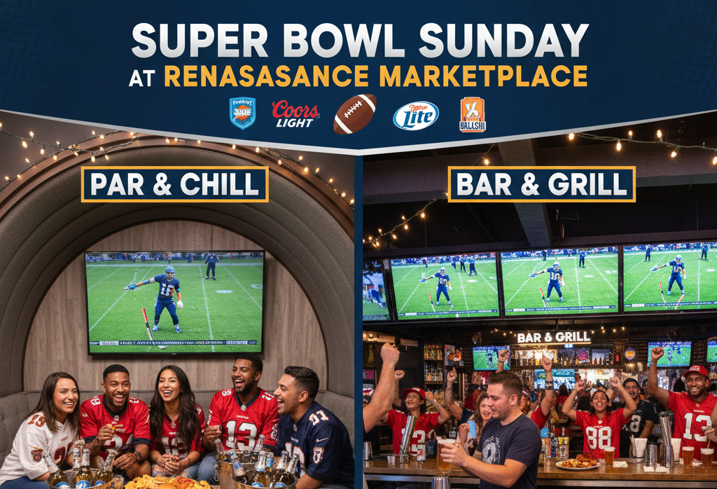 Grab your crew, pick your spot, and enjoy Super Bowl Sunday at Renaissance Marketplace.