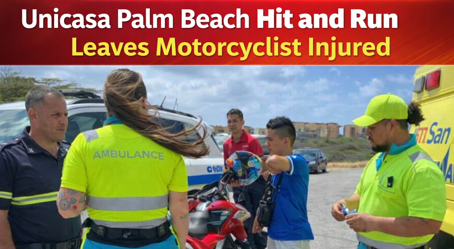 While officers were attending another accident on Sasakiweg, a motorcyclist approached them and reported that he had just been involved in a collision. According to his statement, a vehicle exited Unicasa in Palm Beach, struck him, and immediately fled the scene without stopping.
