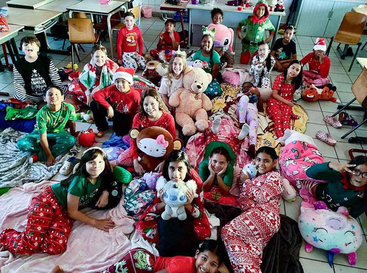 Students arrived dressed in festive Christmas pajamas and settled down on sleeping mats inside their classrooms to enjoy a movie together. The relaxed and joyful atmosphere turned the event into a memorable evening for everyone involved.