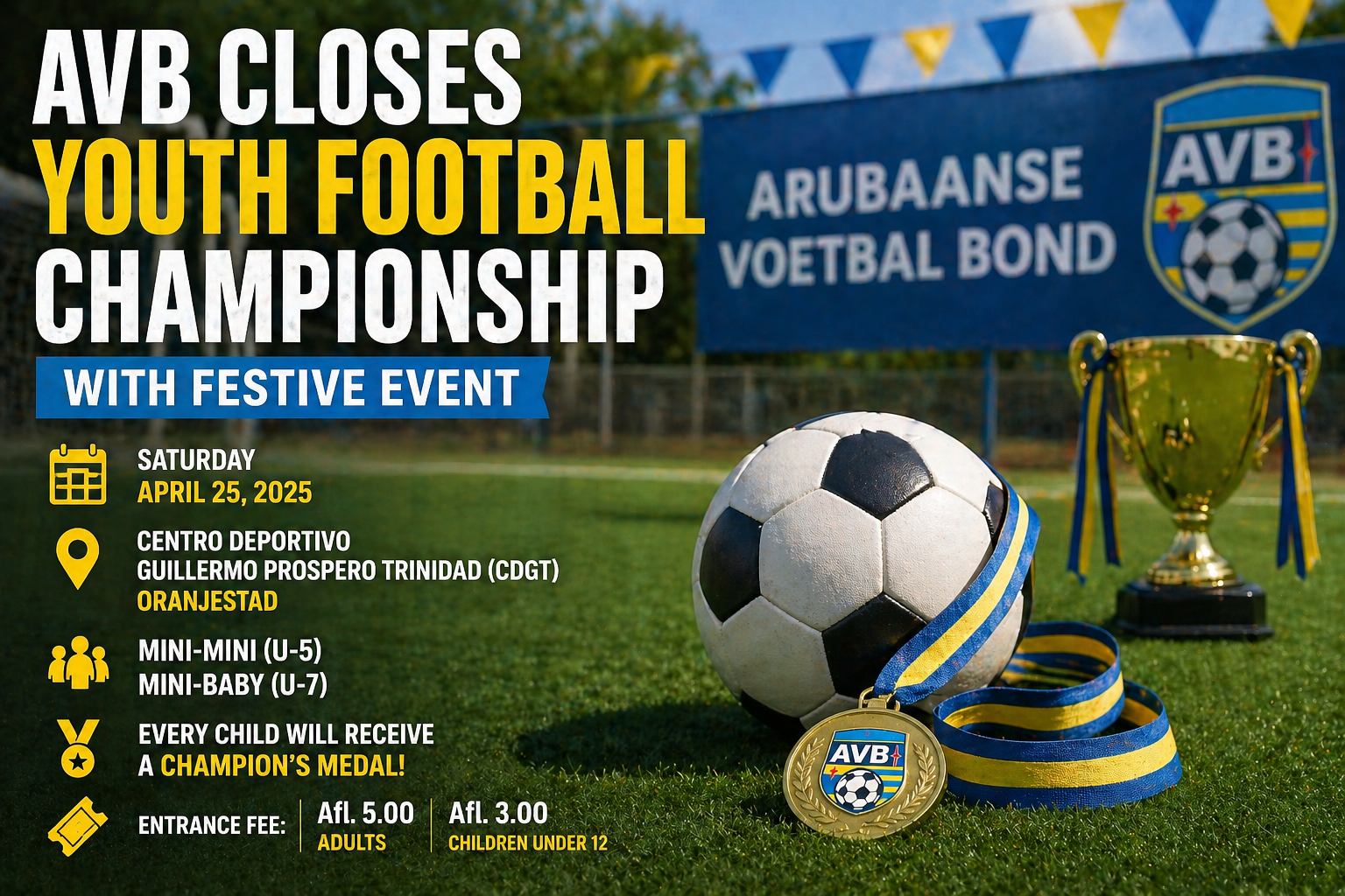 The Arubaanse Voetbal Bond (AVB) is set to officially close the 2025-2026 youth football championship this Saturday, April 25. The closing event, dedicated to the Mini-Mini (U-5) and Mini-Baby (U-7) categories, will take place at the Centro Deportivo Guillermo Prospero Trinidad (CDGT) in Oranjestad. The morning program promises a festive atmosphere for the football community and participating families.
